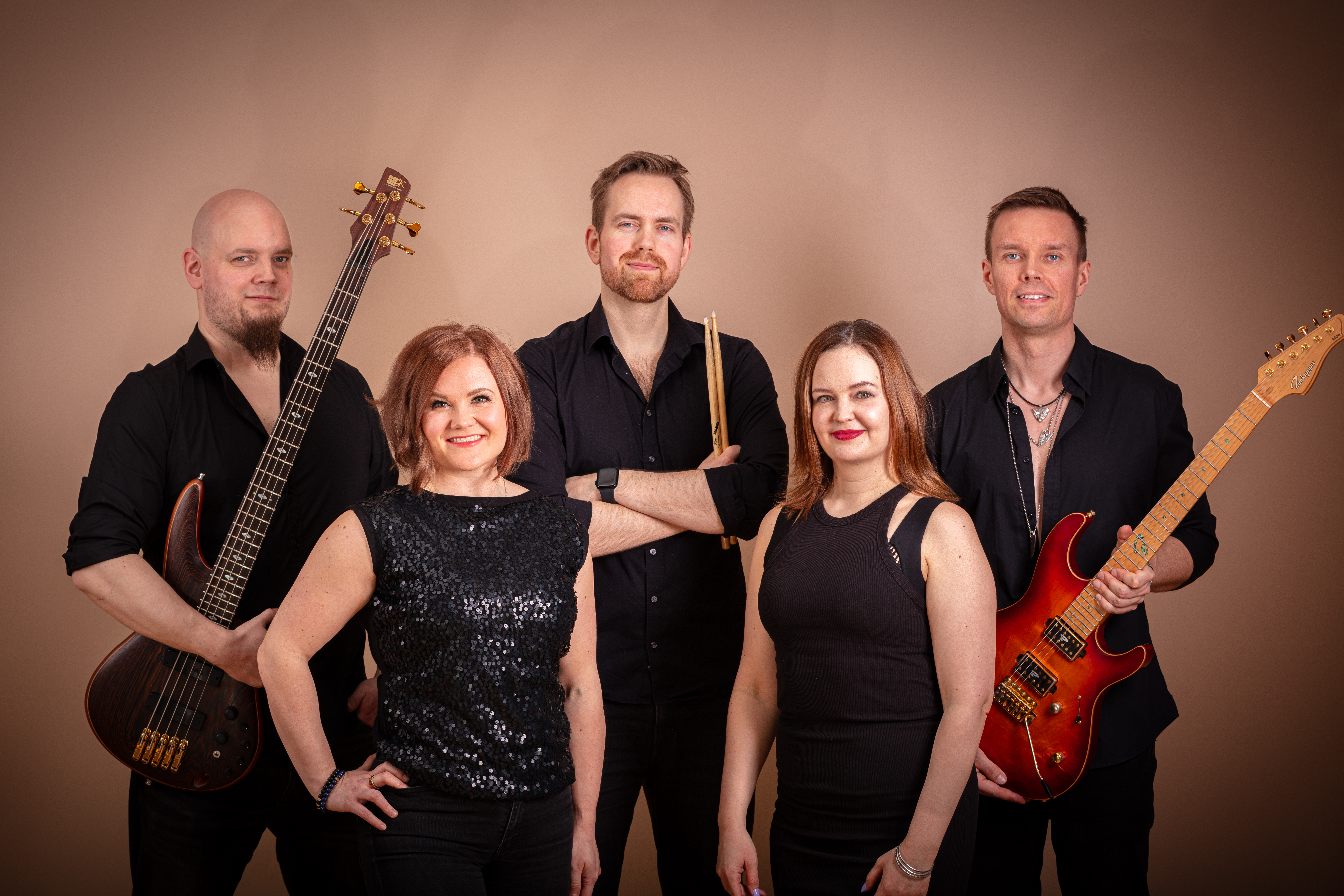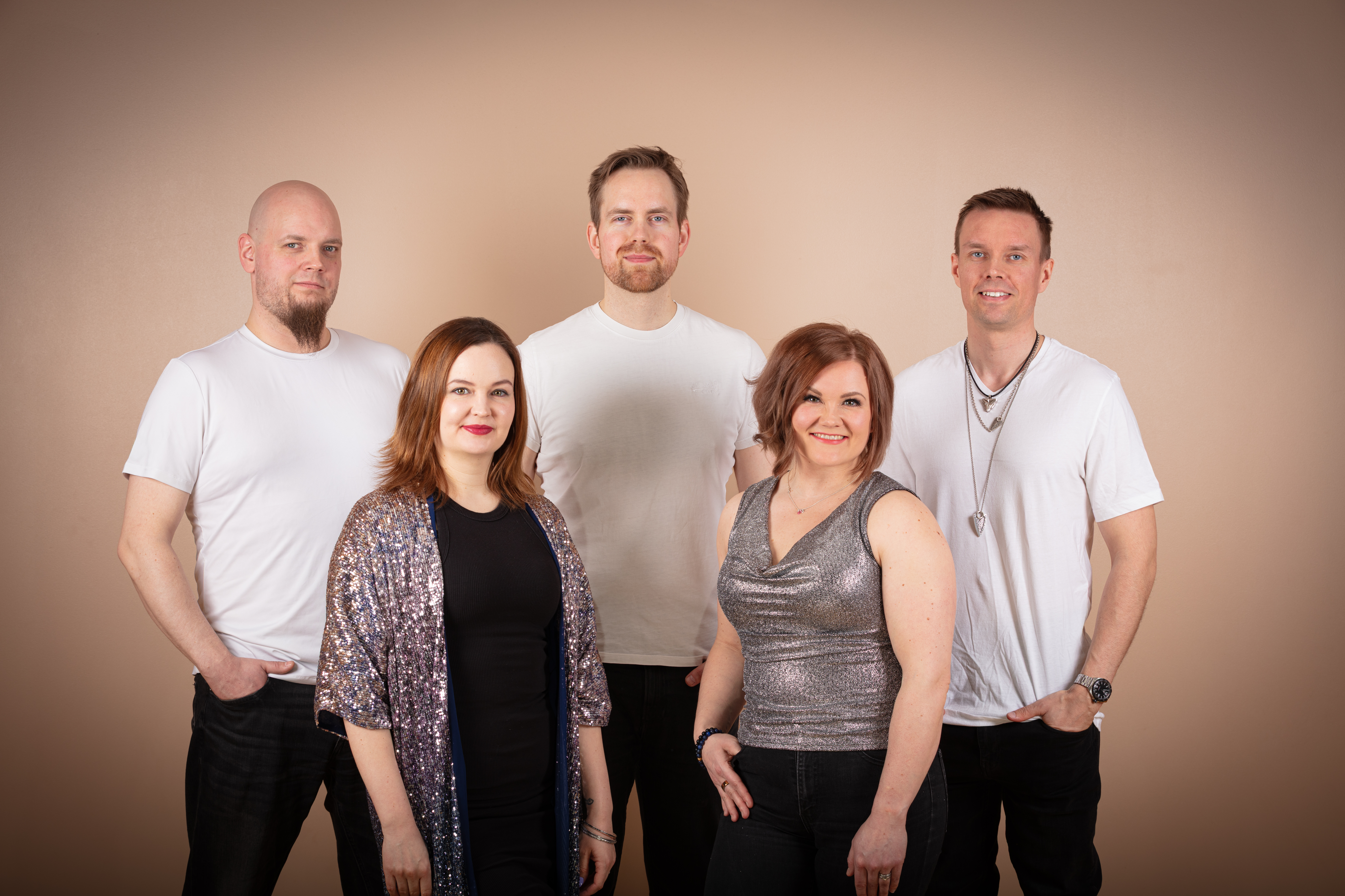 Bändiimme kuuluu 5 jäsentä sekä ääni-/valoteknikko.